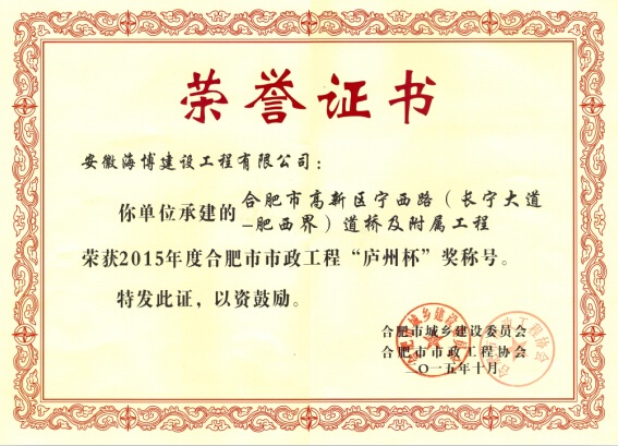 炎炎夏日,驕陽似火,我公司喜獲2015年度合肥市市政工程“廬州杯”獎,給酷熱的盛夏送來了陣陣涼意。由公司承建的合肥市高新區寧西路(長寧大道-肥西界)道橋及附屬工程經合肥市城鄉建設委員會及合肥市市...