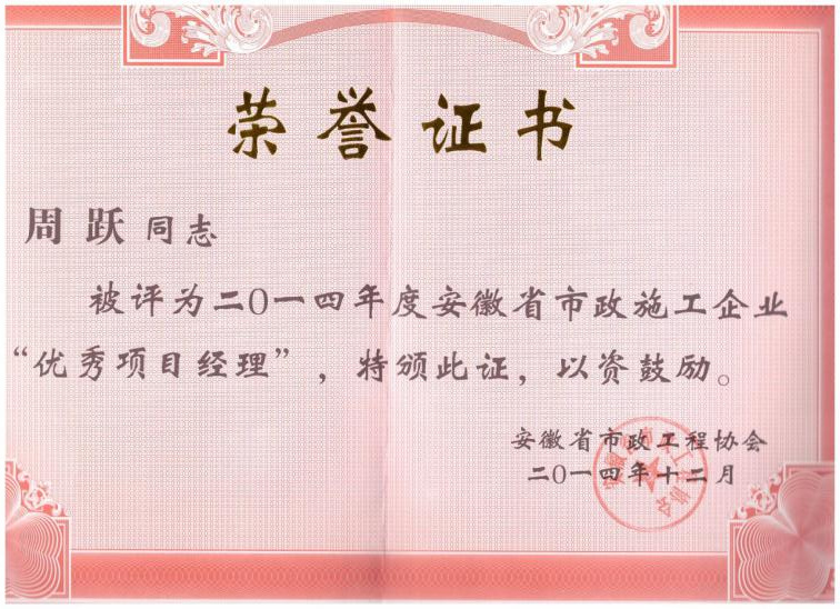 在安徽省市政工程協會評選的2014年度“安徽省市政施工企業優秀項目經理”活動中,共評出49位市政優秀項目經理,我公司周躍、榮飛兩位同志榮獲該項殊榮。...