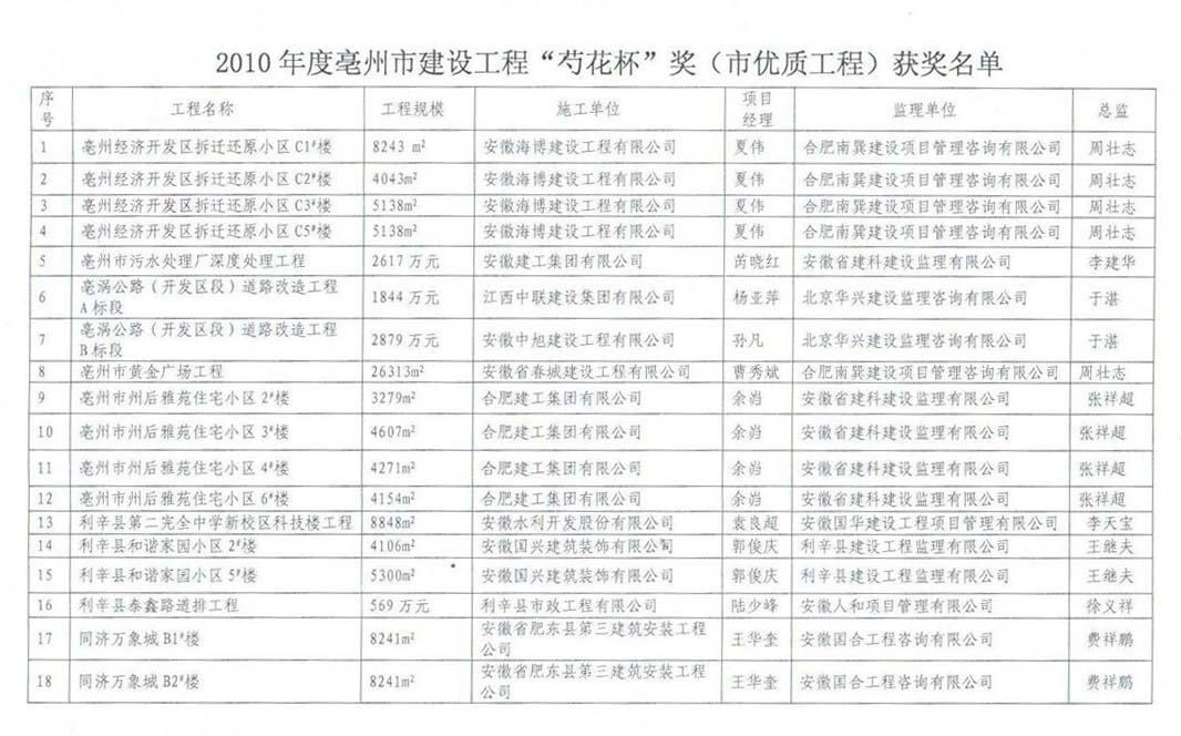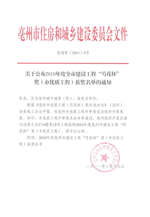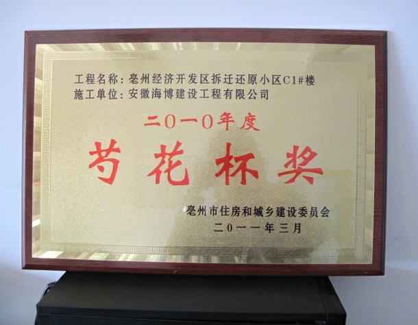 熱烈祝賀由安徽海博建設(shè)工程有限公司亳州項(xiàng)目部承建的亳州經(jīng)濟(jì)開發(fā)區(qū)拆遷還原小區(qū)C1#、C2#、C3#、C5#號樓四個單位工程榮獲2010年度亳州市優(yōu)質(zhì)工程“芍花杯”獎。
