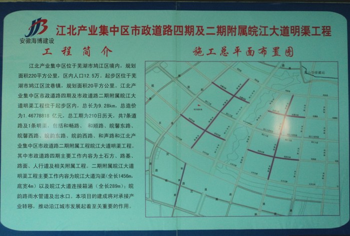 安徽省江北產(chǎn)業(yè)集中區(qū)四期市政道路及二期附屬皖江大道明渠工程位于蕪湖市鳩江區(qū)沈巷鎮(zhèn),工程主要內(nèi)容包括7條道路及1條明渠;道路總長9.28km,分別為和聲路、和暢路、和順路、皖韻東路、皖韻西路、皖馨東路、皖馨西路;皖江大道明渠工程包括明渠段長度1456米,箱涵總長289米,皖韻西路∮1600雨水管247米。工程總造價1.47億元,工期7個月。