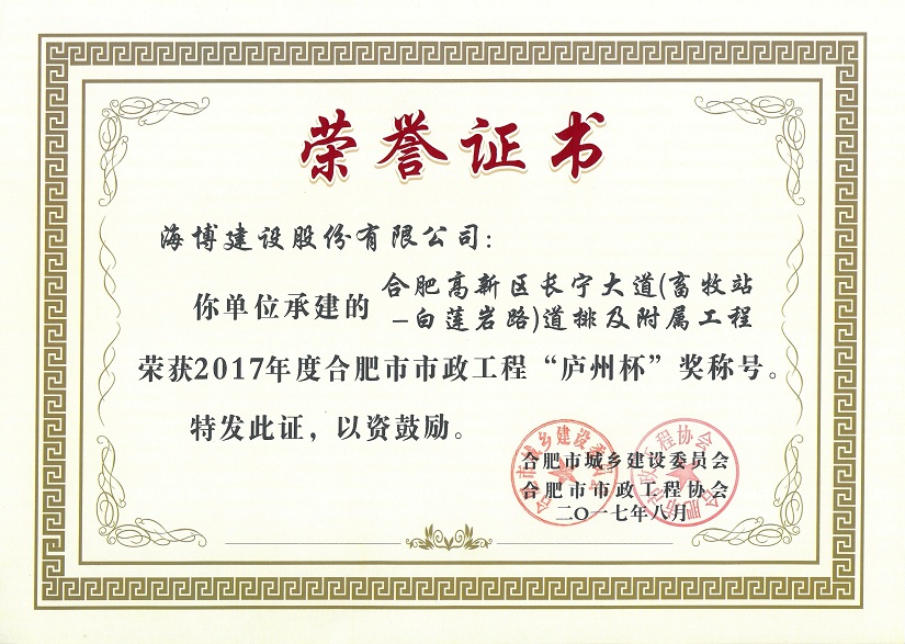 我公司承建的合肥高新區(qū)長(zhǎng)寧大道(畜牧站-白蓮巖路)道排及附屬工程,榮獲了2017年度合肥市市政工程“廬州杯”獎(jiǎng)。